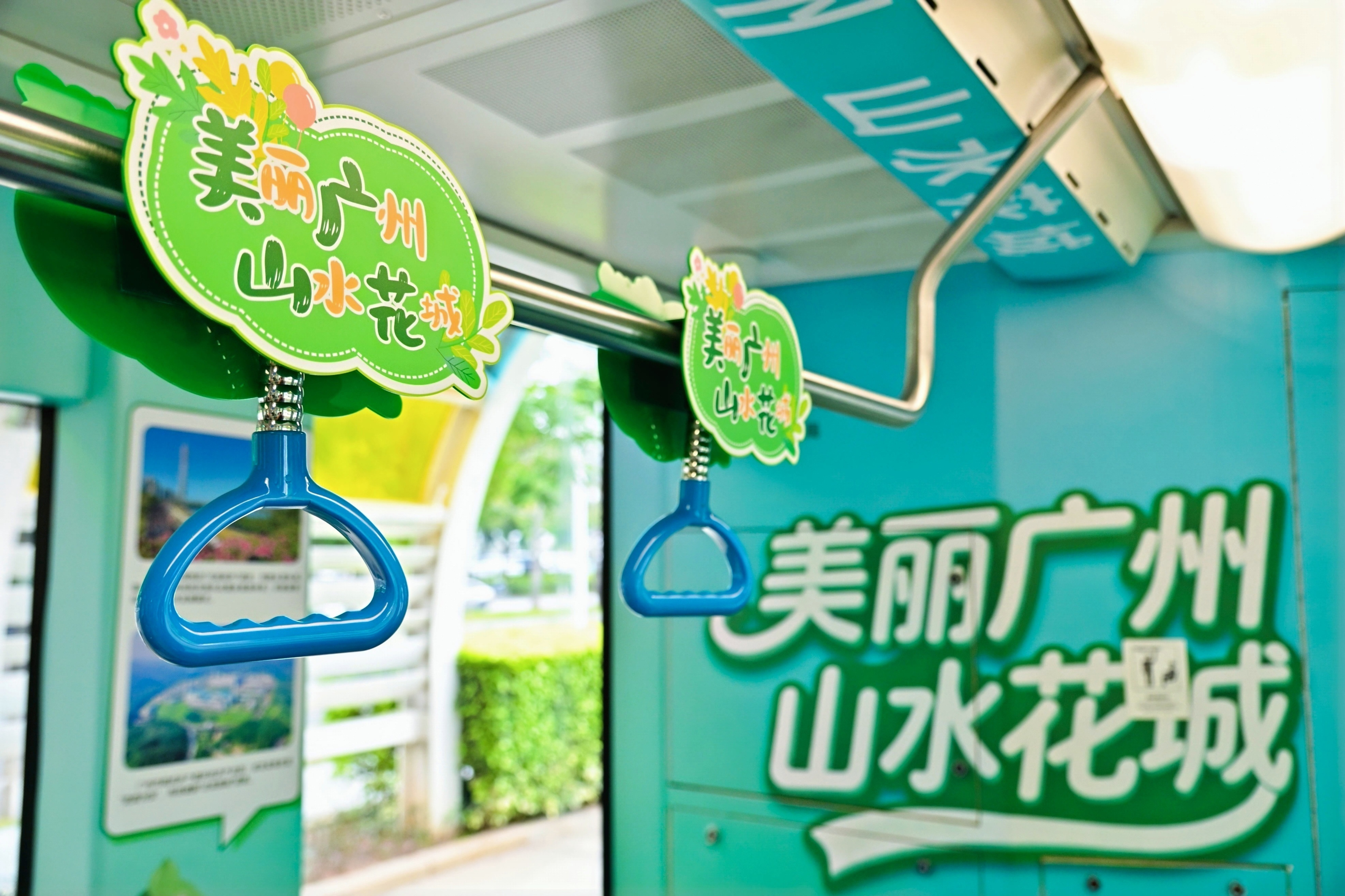 车上4节车厢分别以“云山青”“珠水清”“花城美”“未来明”为主题,构成完整的生态文明实践主题叙事链。其间以一只灵动的小鸟“生态向导”图案贯穿全程:从“云山青”的林间振翅,到“珠水清”的江面掠过,再到“花城美”的街巷穿梭,最终飞向“未来明”的广阔蓝天。